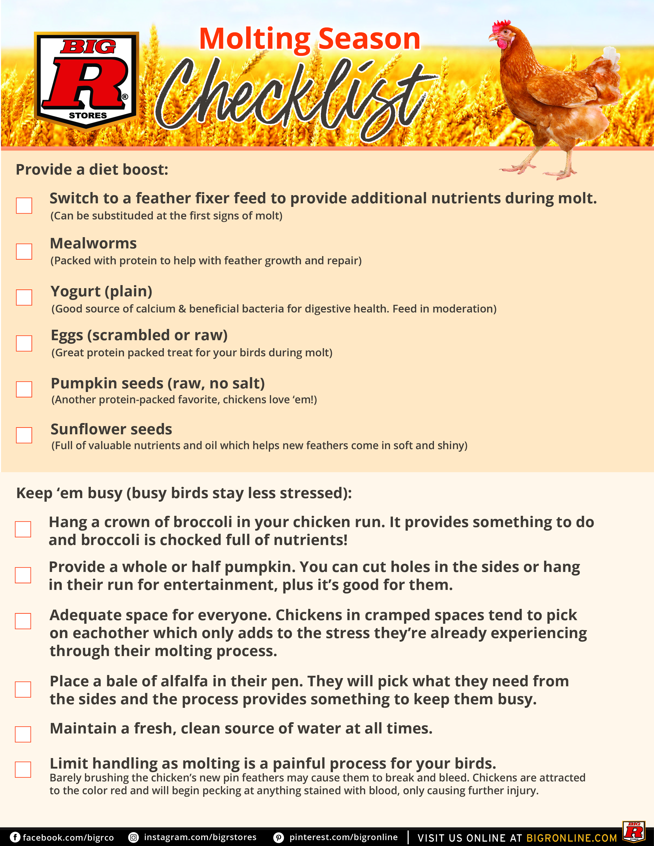 Your chickens will be a bit more stressed during the process of molting so it’s good to provide them extra care and attention to ensure they stay healthy in preparation for winter.